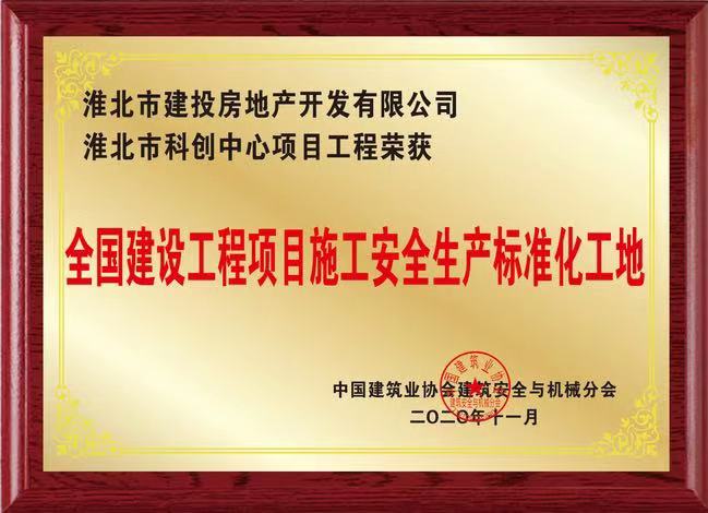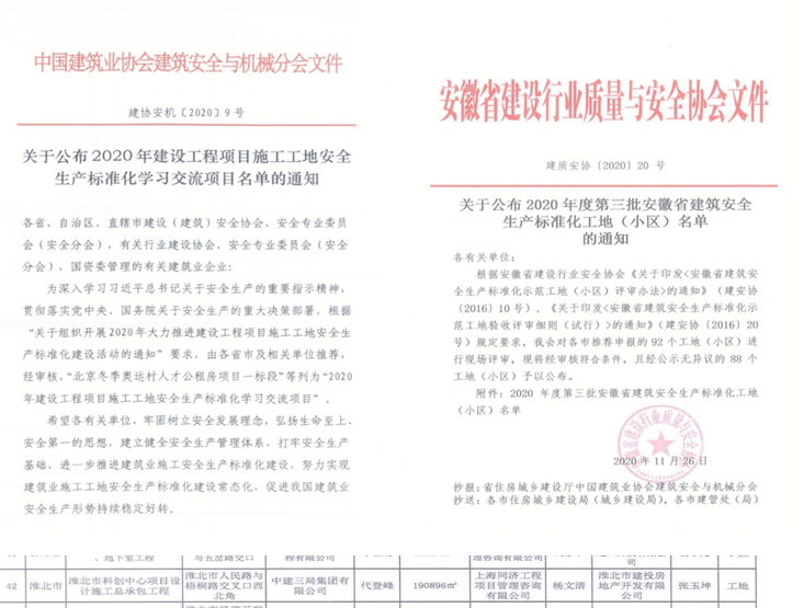 近日, 2020年中國建筑業安全生產管理經驗交流會在北京舉行。會上公布了2020年 “全國建設工程項目安全生產標準化工地”(全國AAA級安全文明標準化工地)名單。 集團公司工程部淮北市科創中心項目工程榮獲 “全國建設工程項目安全生產標準化工地”榮譽。