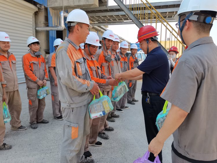 張立哲同志一行來到項目現場,為一線工人送上香皂、洗發水、花露水等慰問品,保障高溫條件下一線員工的安全和健康。張立哲同志還與工友們進行了親切交談,詳細了解通鳴礦業二期建設的進展情況及大家在高溫天氣下的作息時間、工作情況等。