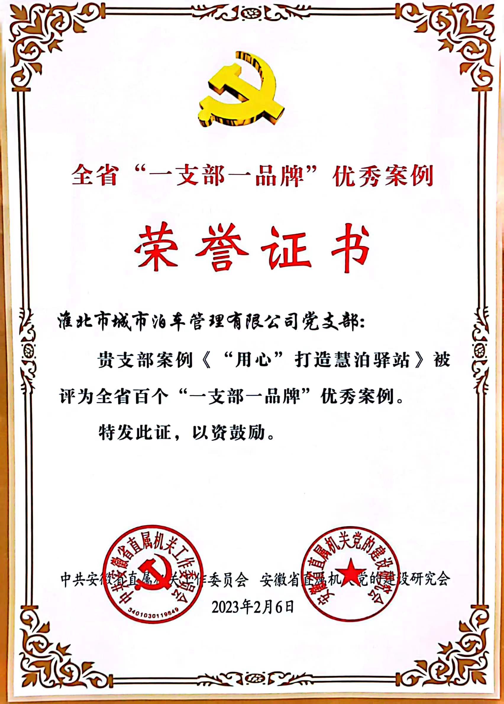 日前,中共安徽省直屬機關工作委員會、安徽省直屬機關黨的建設研究會聯合發文表彰了全省百個“一支部一品牌”黨建工作典型案例,此次“一支部一品牌”黨建工作典型案例評選全省共有400家單位586個優秀案例參加初評和復審,最終綜合評定100個“一支部一品牌”優秀案例。淮北城市泊車管理有限公司黨支部獲得通報表彰,支部的黨建品牌《“用心”打造慧泊驛站》獲評全省百個“一支部一品牌”優秀案例。