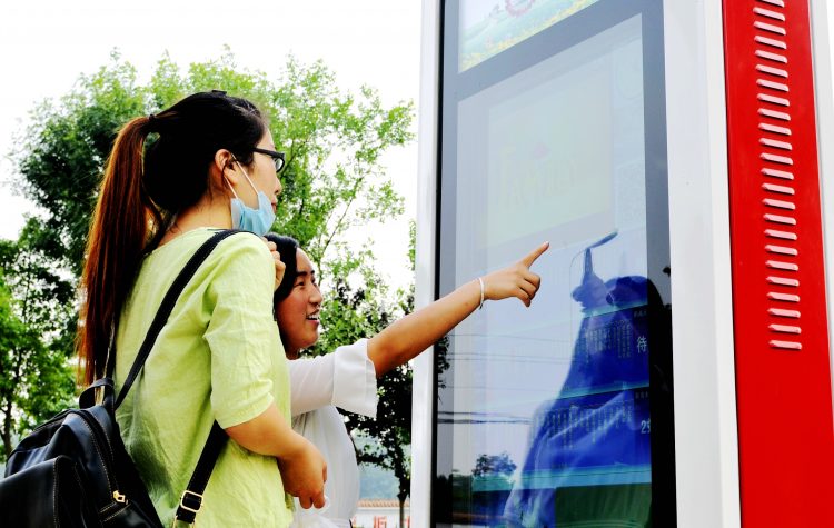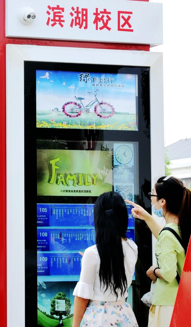 電子公交站牌還沒裝好,就引來了不少大學生的圍觀。電子站牌采用戶外高亮55寸LCD屏,由號位、視頻、LED屏、公交線路四部分組成,分屏顯示公交車到站信息、視頻廣告、公益宣傳、二維碼掃描、時鐘信息、微信平臺等多種信息,減少市民候車的枯燥,視頻右側增加了蘋果版和安卓版的“淮北汽運”微信公眾號二維碼,視頻下方,則滾動顯示公交線路的站點、運行時間等詳細信息,電子站牌最下端還可以實時更新當天的天氣預報。同時結合站牌背面滾動系統可以增加宣傳力度,系統刷新5秒一次,一目了然地看到公交車輛運行的信息,途經該站點由哪幾路公交線路,有幾臺車在各線路上運行,各線路那臺車離該站臺近,結合微信公交讓廣大市民可以做到掐點等車、守時候車。