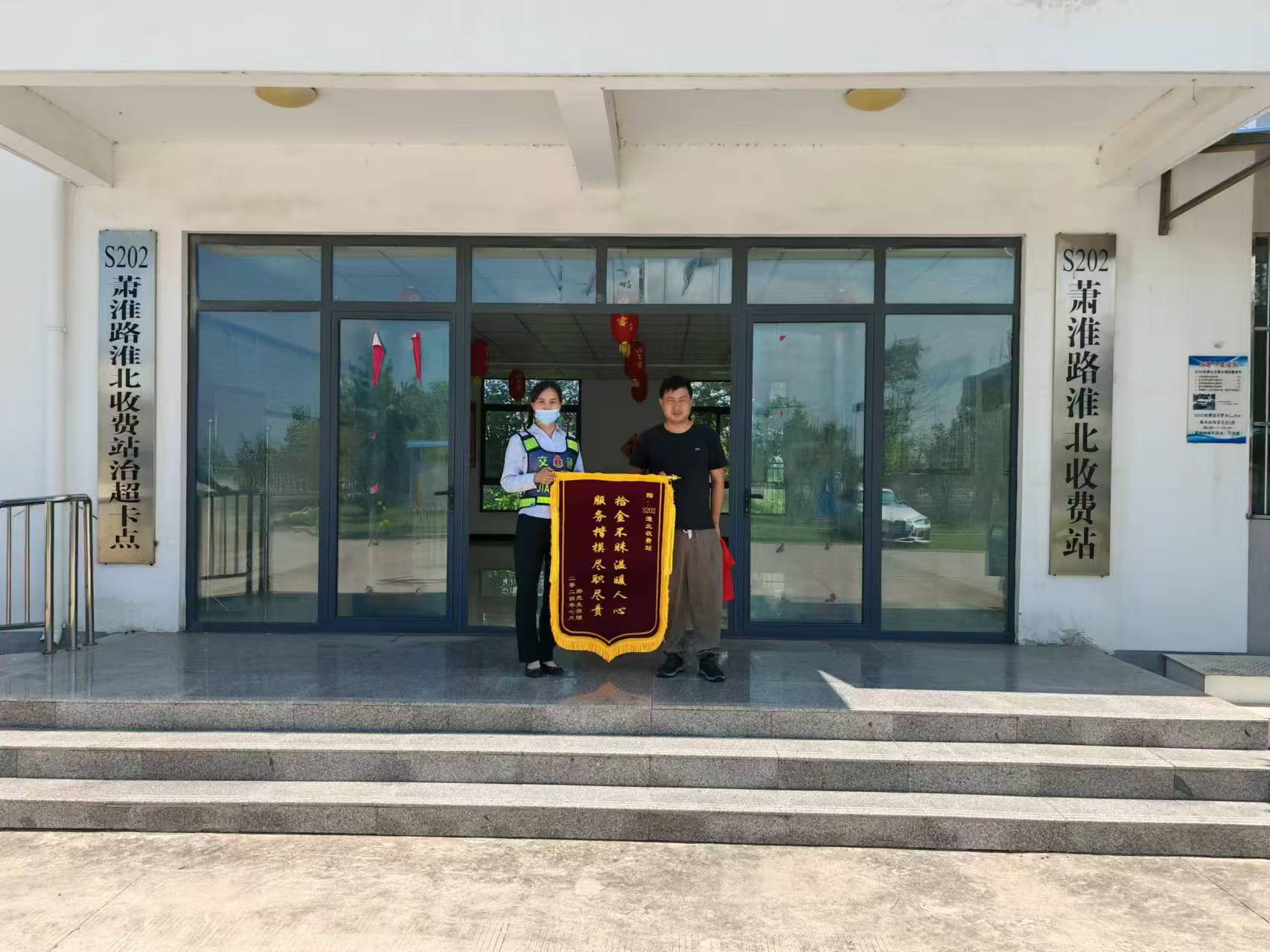 “真的謝謝你們,沒接到你們電話之前,我已經和家里的人找了好久了,一直不知道掉哪里了。感謝你們拾金不昧、樂于助人,送上小小錦旗,聊表謝意!”7月25日,在S202淮北收費站,失主孫先生送上錦旗一個勁地向工作人員道謝。