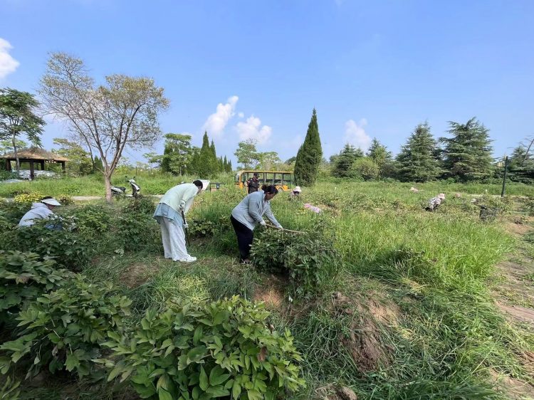 活動中,黨員同志們和運營人員、機關辦公室人員齊上陣,手持鐮刀、鋤頭等除草工具,主動認領除草修剪區(qū)域,鏟除牡丹花周邊的雜草、枯樹枝等雜物,積極投入到對牡丹園的養(yǎng)護工作中去,爭當“綠水青山”的護衛(wèi)者,盡管烈日當頭,酷暑難耐,卻絲毫未消減大家志愿服務的熱情和保護環(huán)境的堅定決心。?