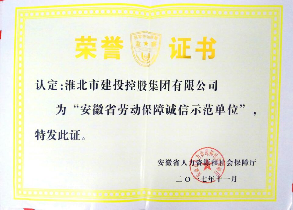 淮北市建投集團榮獲安徽省勞動保障誠信示范單位