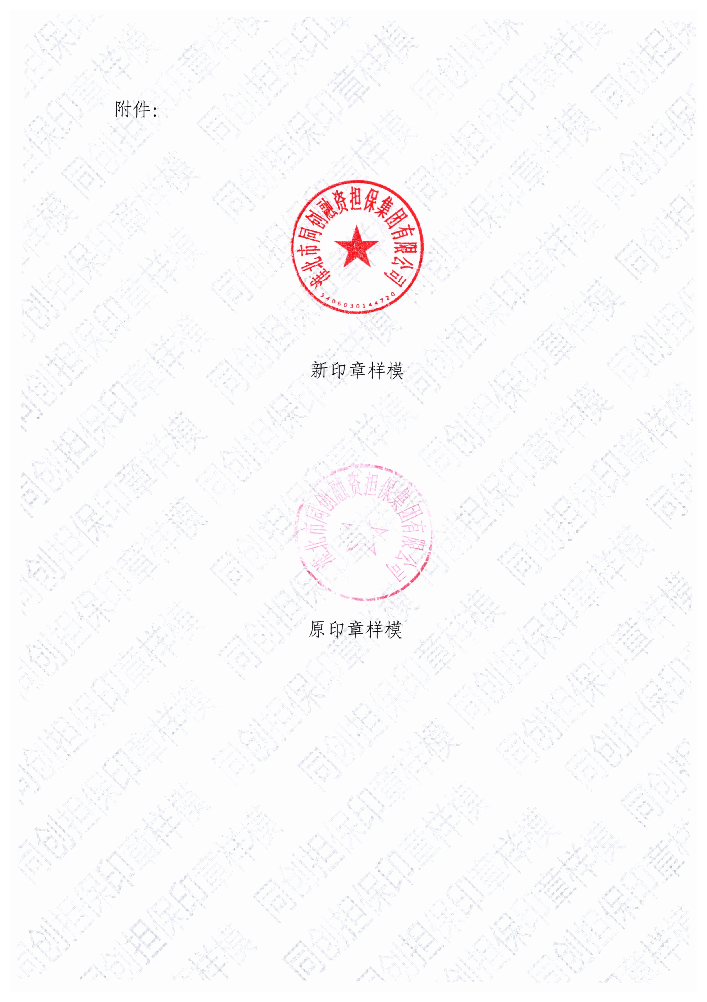 根據工作需要,從即日起啟用“淮北市同創擔保集團有限公司”新印章,“淮北市同創擔保集團有限公司”原印章同時廢止。 特此通知。