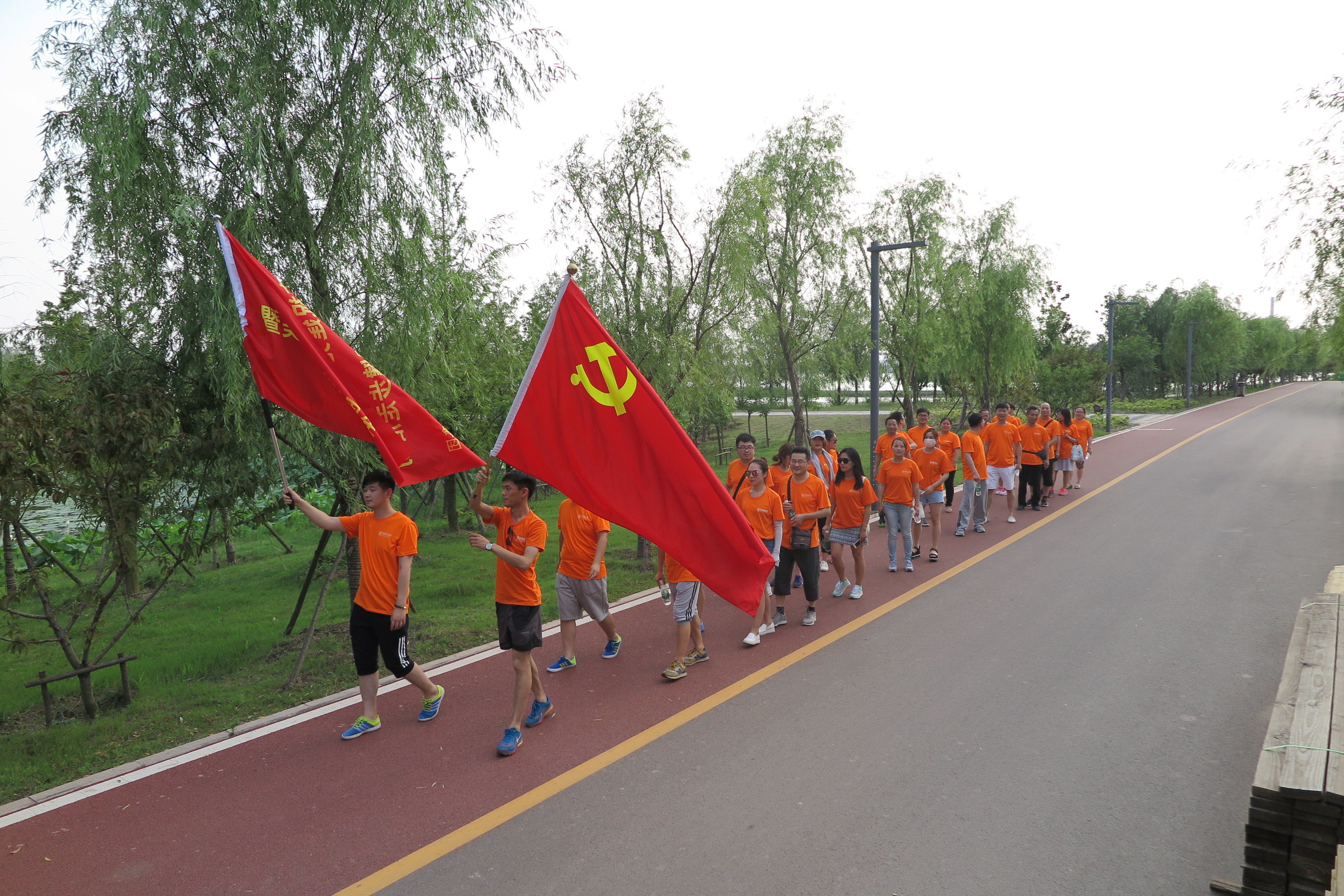 健步活動在美麗的南湖公園舉行,橘紅的身影、飄揚的旗幟與蔚藍的南湖融為一體。途中,大家邁著矯健的步伐,高舉黨旗,充分發揚友愛互助的團隊精神,圓滿的完成了7.5公里的徒步活動。雖然酷熱當頭,但也更印證了每位員工心中那顆對黨的火熱的心。健步隊伍整齊有序、活動現場氣氛熱烈,大家昂首闊步,走出了擔保人的活力和風采。