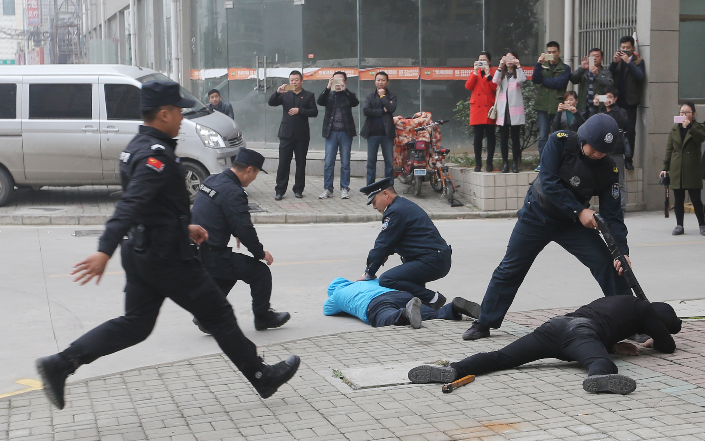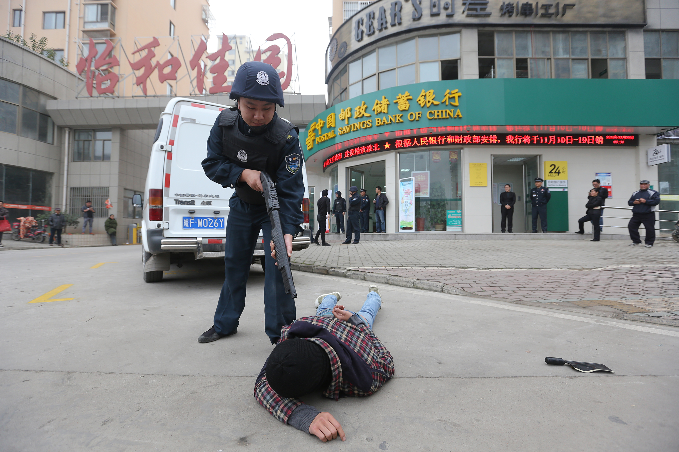 為切實(shí)提高押運(yùn)隊(duì)員安全防范意識(shí),使押運(yùn)隊(duì)員進(jìn)一步熟悉和掌握防暴力搶劫應(yīng)急預(yù)案流程,增強(qiáng)員工應(yīng)對(duì)突發(fā)事件的處置能力和實(shí)戰(zhàn)能力,按照中國(guó)郵政儲(chǔ)蓄銀行安全保衛(wèi)工作要求,淮北市保安有限公司聯(lián)合特警支隊(duì)、中國(guó)郵政儲(chǔ)蓄銀行于2016年11月19日上午9時(shí)在中國(guó)郵政儲(chǔ)蓄銀行惠苑路支行處實(shí)施運(yùn)鈔車(chē)突遇犯罪份子持刀搶劫款箱應(yīng)急置預(yù)案聯(lián)合演練。