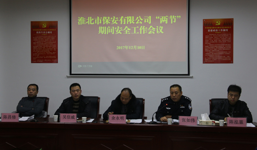 2017年12月10日晚,淮北市保安有限公司在六樓會議室召開“兩節”期間安全工作會議和講服務、轉作風專項整頓活動啟動儀式,公司領導班子成員及市監管支隊政委張如偉同志出席會議。