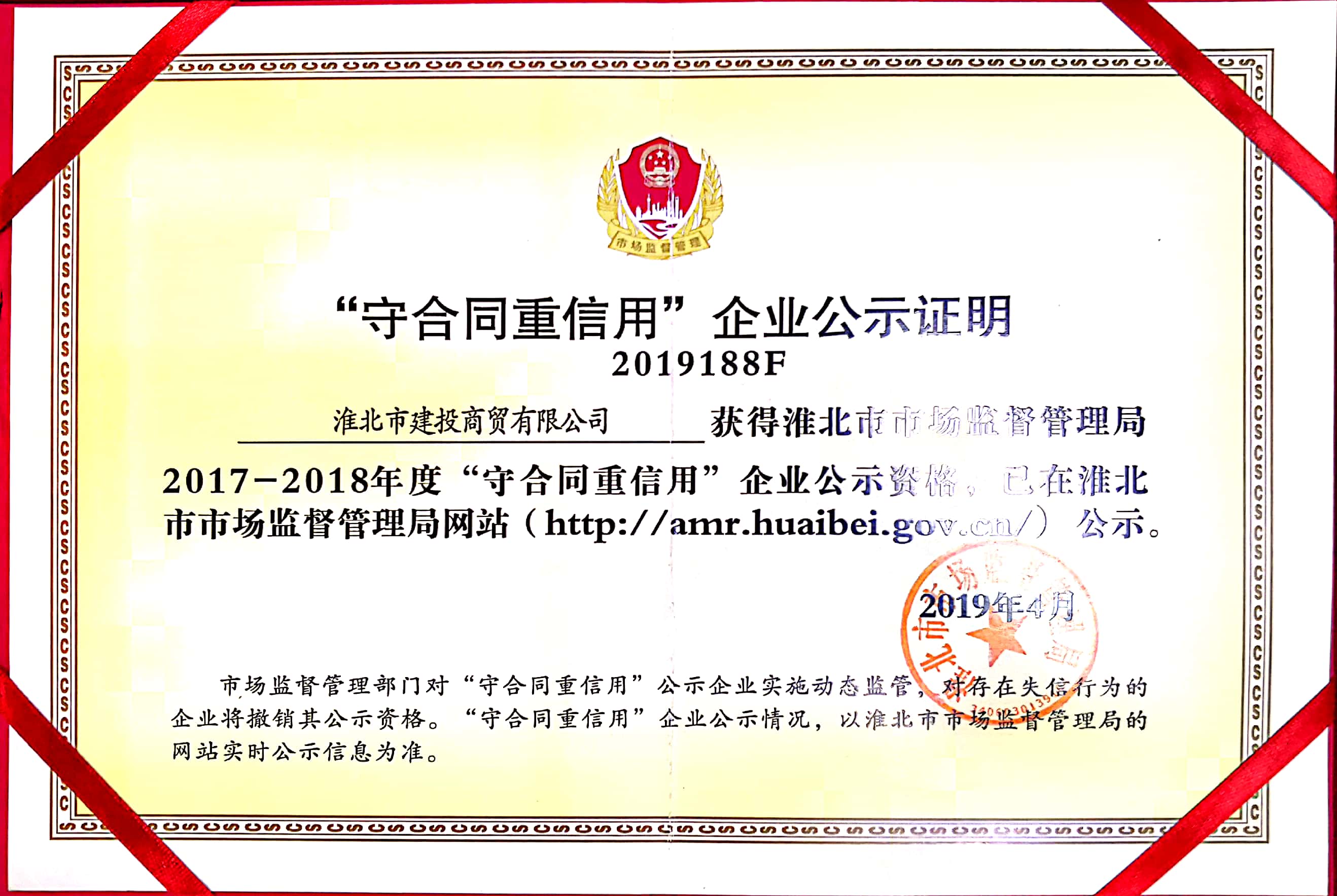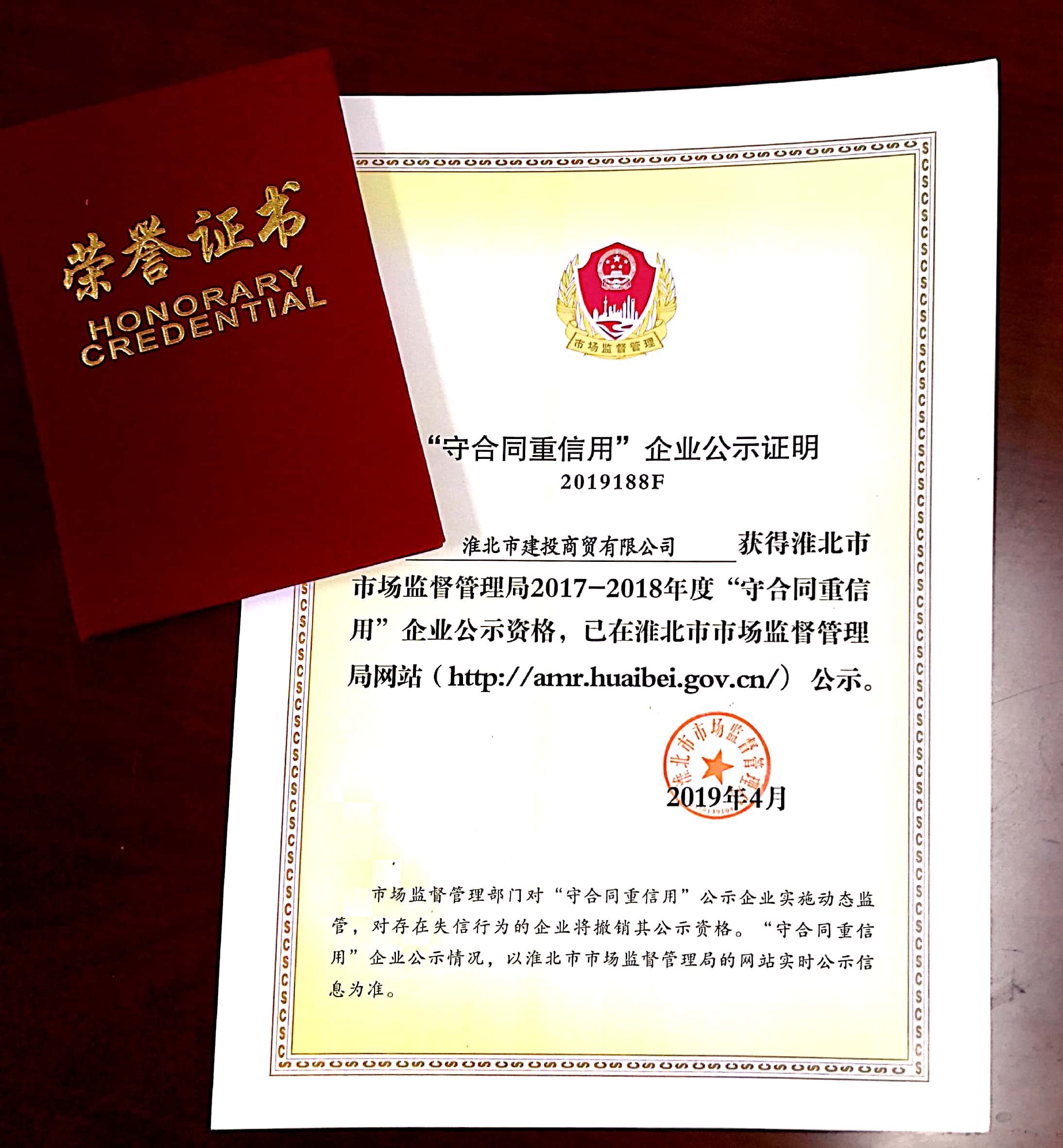 淮北市建投商貿(mào)有限公司獲此殊榮,有賴社會(huì)各界對(duì)公司的信任和支持,“守合同重信用”榮譽(yù)是企業(yè)的金字招牌,能有效提升企業(yè)自身誠信管理水平及內(nèi)部管理標(biāo)準(zhǔn)。