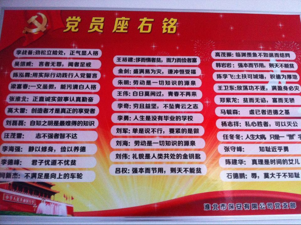 為了進一步組織和動員廣大黨員更好地為群眾辦實事、做好事、解難事,淮北市保安公司黨支部結合“兩學一做”活動,在全體黨員中開展“座右銘展示”活動,要求每個在職黨員以座右銘鞭策自己的行動,轉變工作作風,進一步塑造黨員的良好形象。